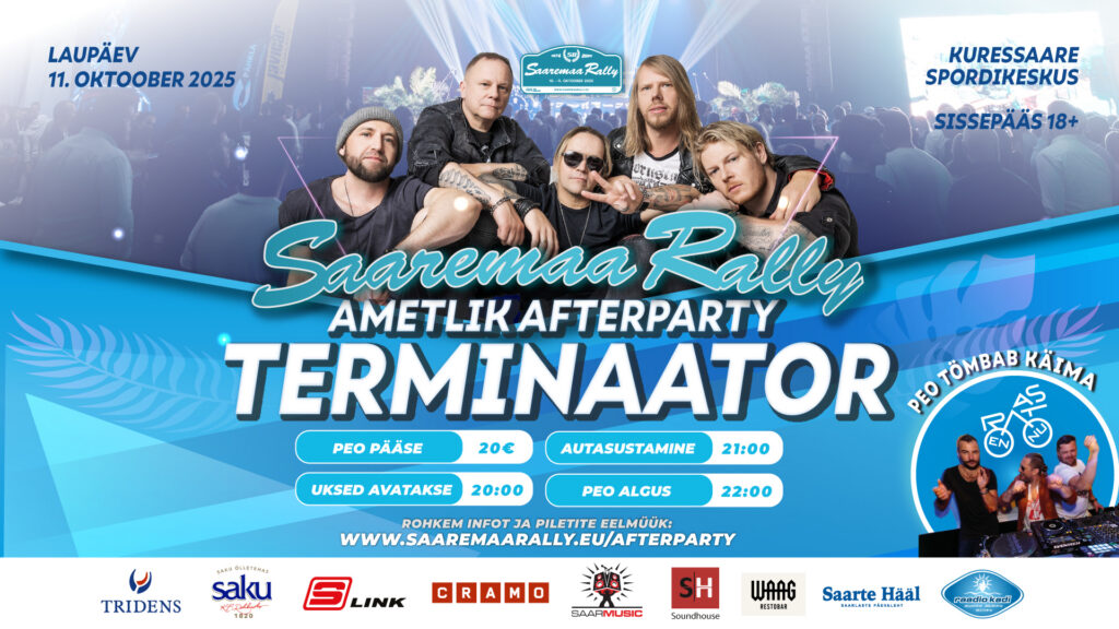 The official afterparty of Saaremaa Rally 2025 will take place on Saturday, 11 October 2025 at the Kuressaare Sports Center. We welcome all friends of Saaremaa Rally from near and far—and friends of friends are welcome too! Our doors are open to everyone! The legendary party series ENNU RATAS will get the party started, and the headliner is Estonia’s best live band TERMINAATOR.
